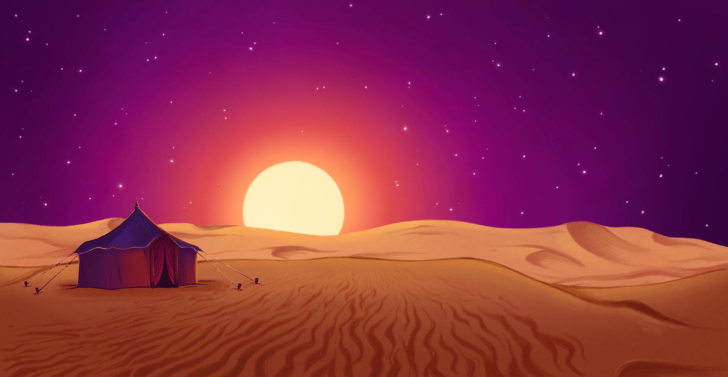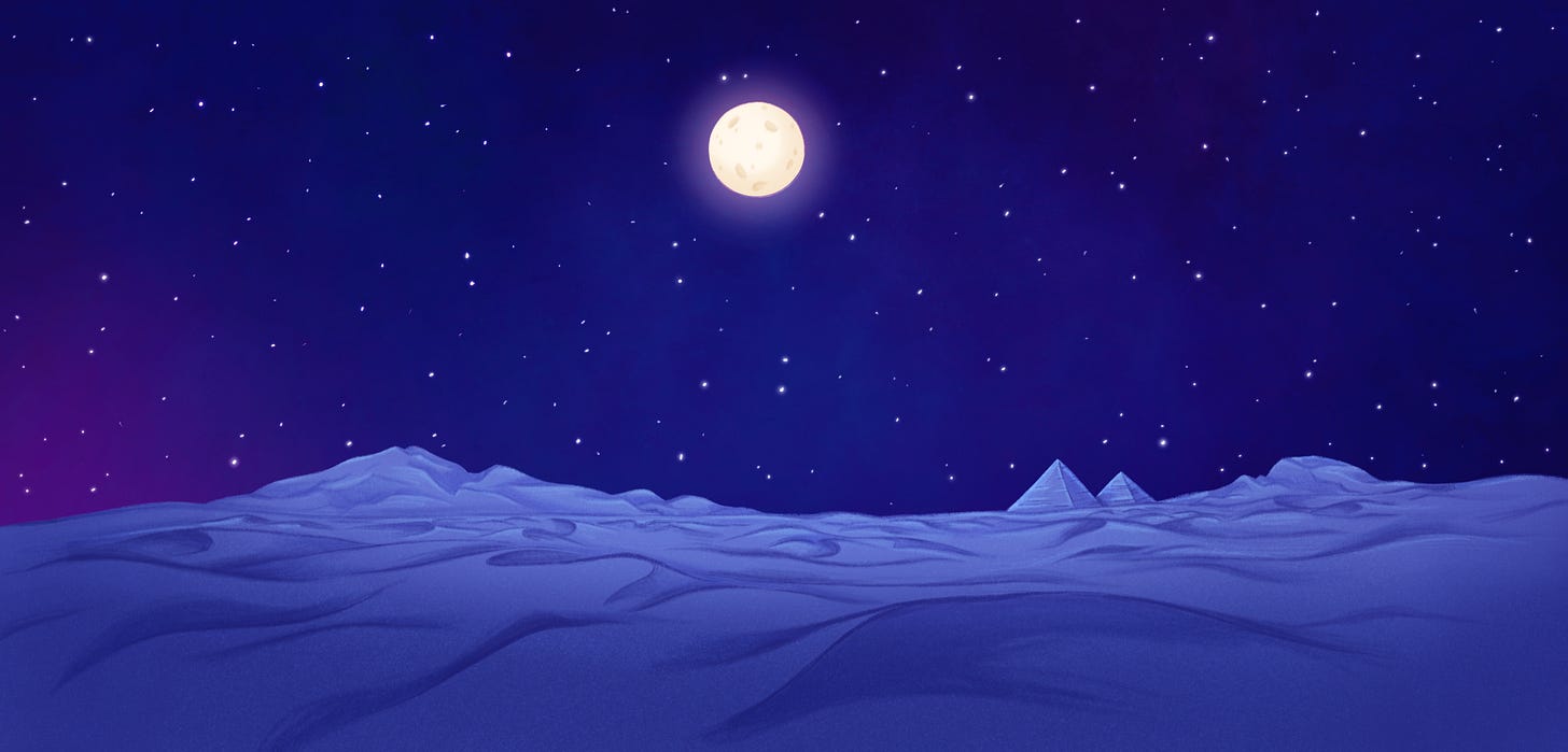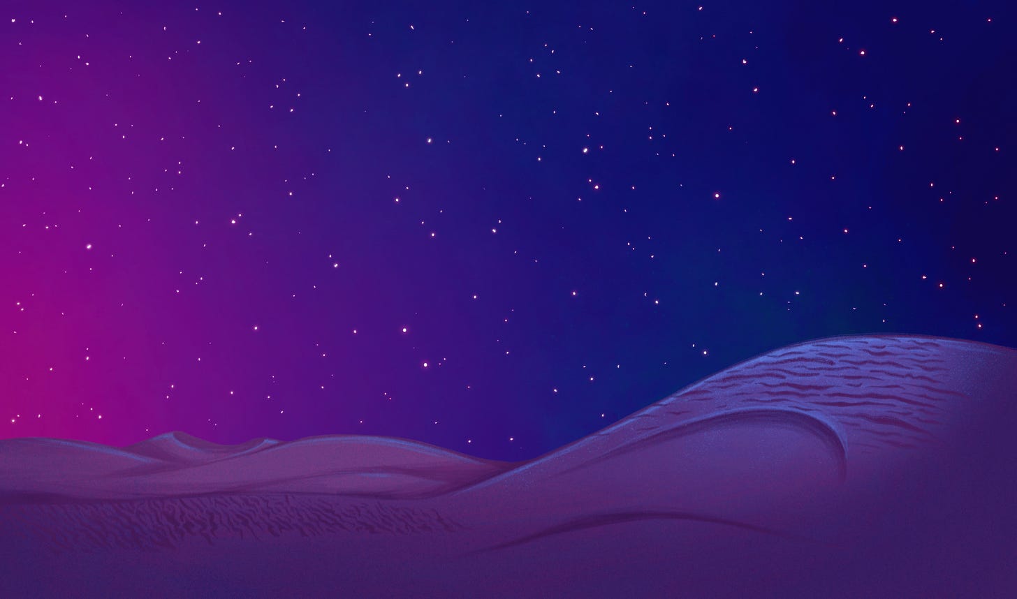 On a cinematic level, I was inspired by several iconic deserts, and passed those influences along to our layout designer Brandon Warren, concept artist Gabi.Illus, and our painter Maureen Narro at Mako Animation Studios. We looked at scapes from the desert planet of Tatooine in Star Wars a New Hope, The Mandalorian, and The Force Awakens. As I mentioned in previous blogs, I worked on the Tatooine set on The Book of Boba Fett, so that place holds nostalgia and tactile memory for me. We also looked at The Prince of Egypt which captured Moses’ flight FROM Egypt so beautifully. I’ve always loved deserts, being of ancestry that descends from the Fertile Crescent. I grew up in the San Fernando Valley (a desert) and had the great privilege of working on an update project at Walt Disney Imagineering for Mission Space, which takes place on Mars. We got to team up with Nasa and experience live VR on the martian planet, which solidified even deeper, my affinity for deserts and their mysterious beauty.