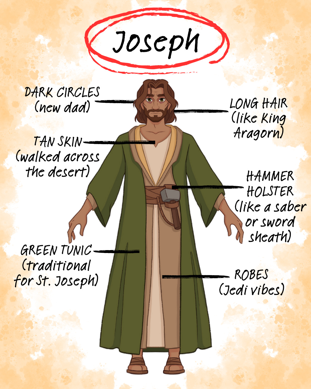 Character Design: Tradition has had several interpretations of Saint Joseph’s age. Some believe he was an elderly man when he married Mary, therefore making his perseverance in chastity more explainable. Others believe that old men don’t walk to Egypt, interpreting his age to be more in sync with Our Lady’s. Wanting to honor both views, we based our character design on Aragorn from Peter Jackson’s Lord of the Rings. Aragorn, being half elf, is an 87 year old man in a 30 year old man’s body. Saint Joseph’s facial features and hair length are a nod to the King of Gondor. Both men were strong, humble, and servant leaders.